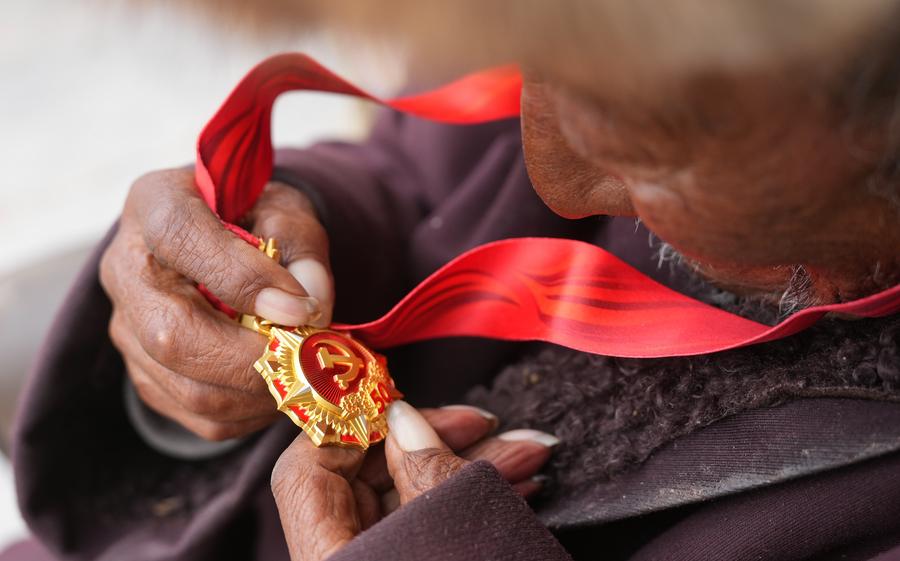 Sonam Tashi looks at a commemorative medal awarded to him after 50 years of Communist Party of China membership in Chubzang village of Doilungdeqen District in Lhasa, southwest China's Xizang Autonomous Region, March 20, 2025. (Xinhua/Jigme Dorje)