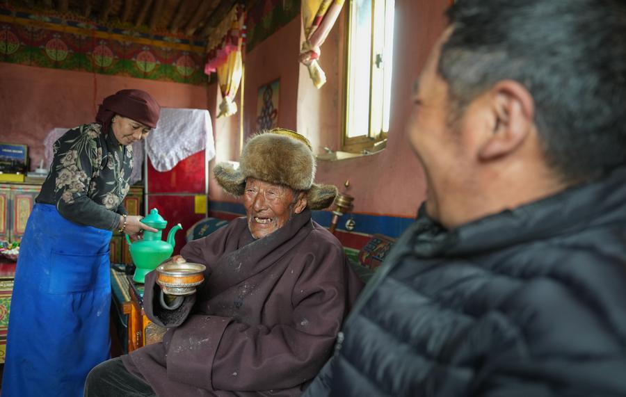 Sonam Tashi (C) chats with family members in Chubzang village of Doilungdeqen District in Lhasa, southwest China's Xizang Autonomous Region, March 20, 2025. (Xinhua/Jigme Dorje)