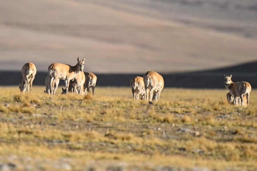 Pregnant Tibetan antelopes are pictured at sunset in Changtang National Nature Reserve in southwest China's Xizang Autonomous Region.
