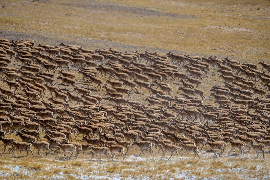 Tibetan antelopes are on migration in Changtang National Nature Reserve in southwest China's Xizang Autonomous Region.