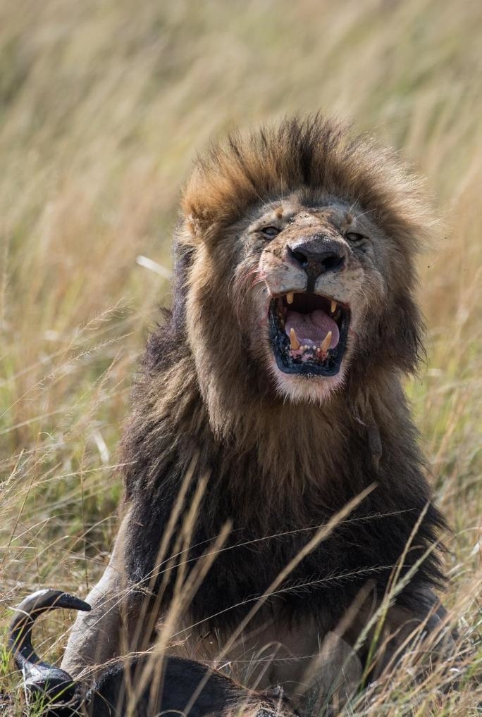 A male lion roars beside a freshly killed wildebeest in Kenya's Masai Mara National Reserve.