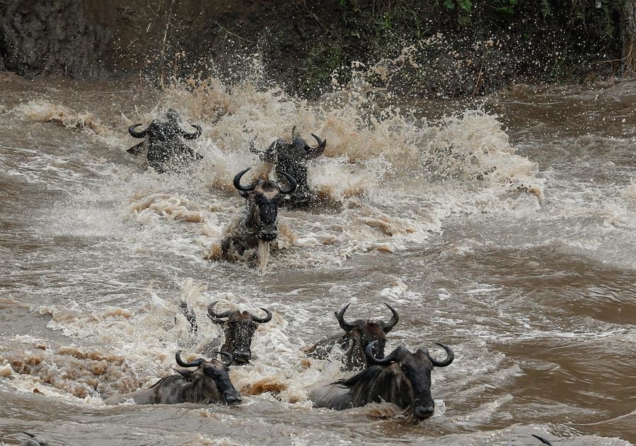 A herd of wildebeests cross the Mara River in Kenya's Masai Mara National Reserve.