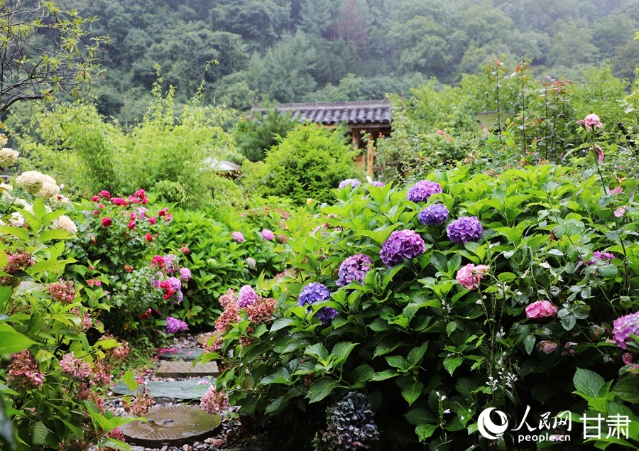 Photo shows blooming flowers in the courtyard of a B&B in Liziba village, Tielou Tibetan Township, Wenxian county, Longnan city, northwest China's Gansu Province. (People's Daily Online/Shao Lan)