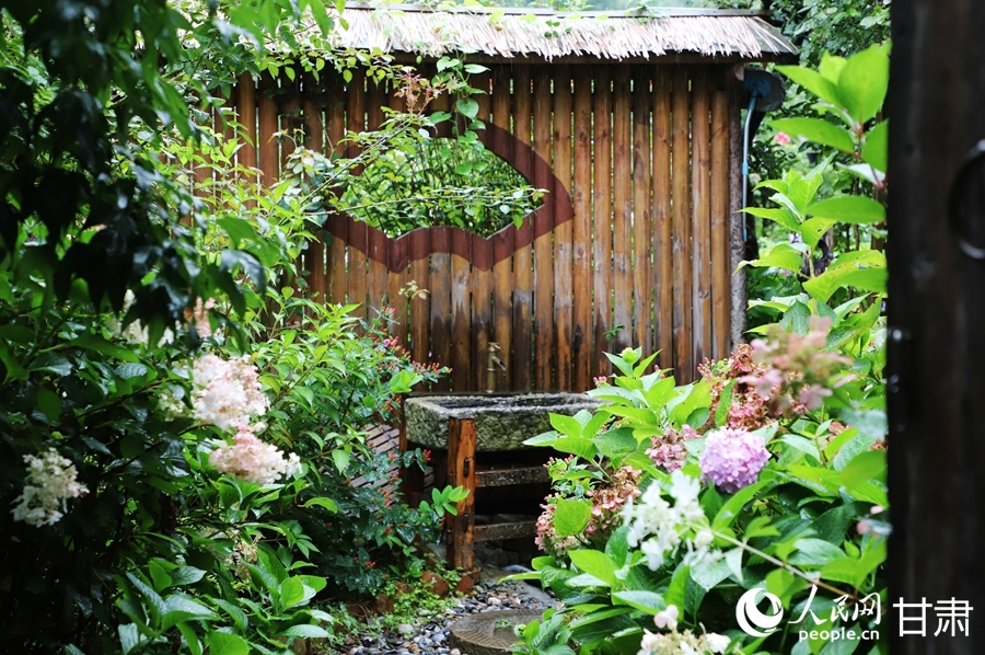 Photo shows blooming flowers at the entrance of a B&B in Liziba village, Tielou Tibetan Township, Wenxian county, Longnan city, northwest China's Gansu Province. (People's Daily Online/Shao Lan)