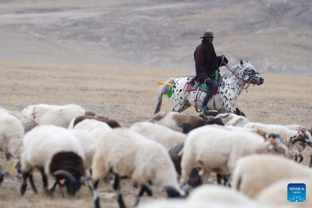 A herder drives his livestock to leave the summer pasture in Dulan County, the Mongolian-Tibetan Autonomous Prefecture of Haixi, northwest China's Qinghai Province, Sept. 9, 2025. Recently, herders in Dulan County have begun their autumn-winter migration. For centuries, herders living in the Qaidam Basin have carried out seasonal migrations twice a year to maintain a balance between the vitality of the grasslands and the growth of their livestock. This year, about 1.23 million head of livestock in Dulan County are expected to take part in migrations, which are scheduled to conclude by mid-October. (Xinhua/Qi Zhiyue)