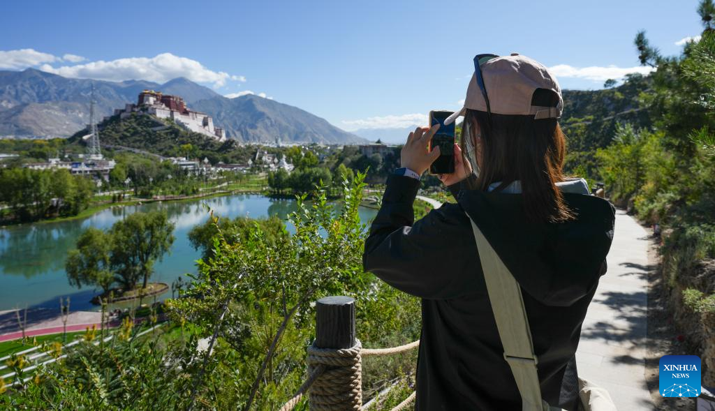 A visitor takes photos of the Potala Palace in Lhasa, southwest China's Xizang Autonomous Region, on Sept. 25, 2025. (Xinhua/Jigme Dorje)