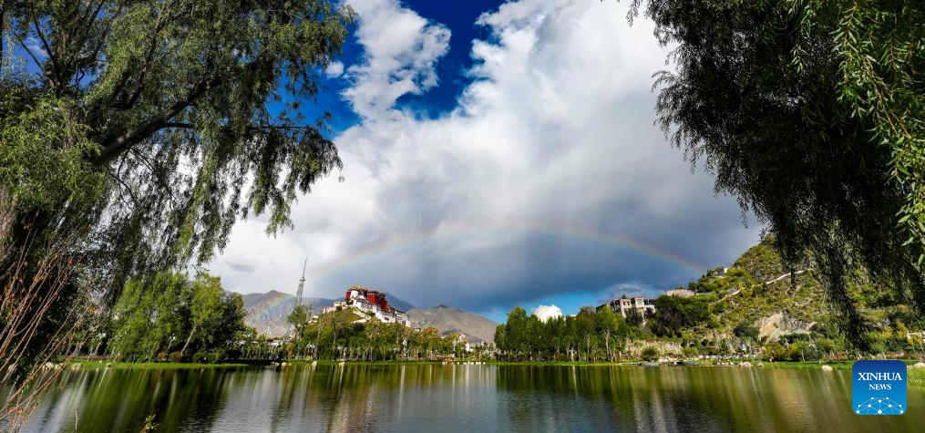 This photo taken on Sept. 21, 2025 shows a view of the Potala Palace in the distance under a rainbow in Lhasa, southwest China's Xizang Autonomous Region. (Xinhua/Jigme Dorje)