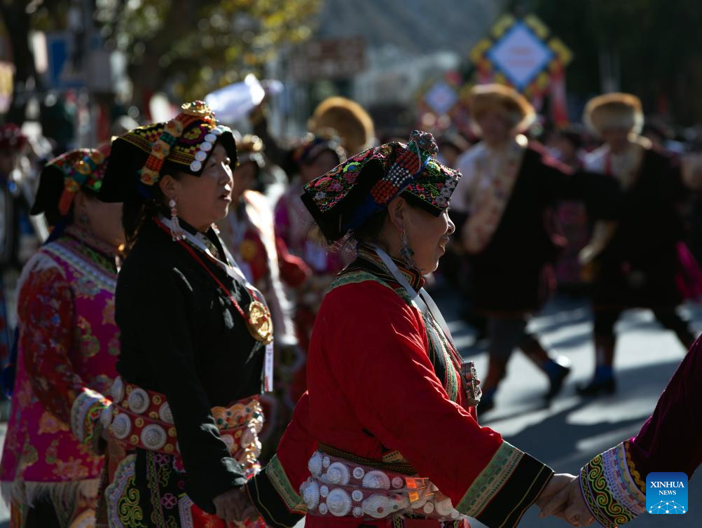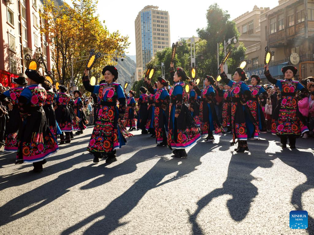 Women in ethnic attire perform during an event celebrating the Qiang New Year in Wenchuan County, Aba Tibetan and Qiang Autonomous Prefecture, southwest China's Sichuan Province, Nov. 19, 2025. An event celebrating the Qiang New Year was held here on Wednesday, starting a series of activities to celebrate the Qiang New Year, which falls on Nov. 20 this year.