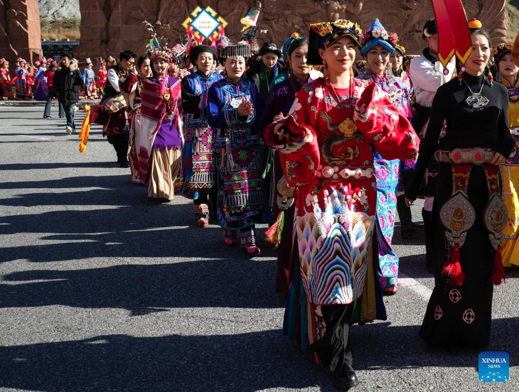 Women in ethnic attire attend an event celebrating the Qiang New Year in Wenchuan County, Aba Tibetan and Qiang Autonomous Prefecture, southwest China's Sichuan Province, Nov. 19, 2025. An event celebrating the Qiang New Year was held here on Wednesday, starting a series of activities to celebrate the Qiang New Year, which falls on Nov. 20 this year.