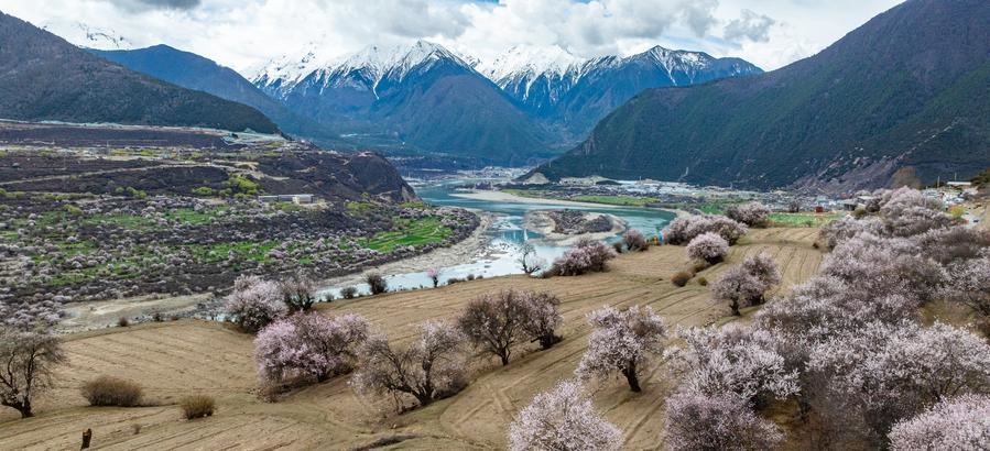 A drone photo taken on April 3, 2026 shows peach blossoms at the foot of Mount Namcha Barwa in Nyingchi City, southwest China's Xizang Autonomous Region. (Xinhua/Tenzin Nyida)