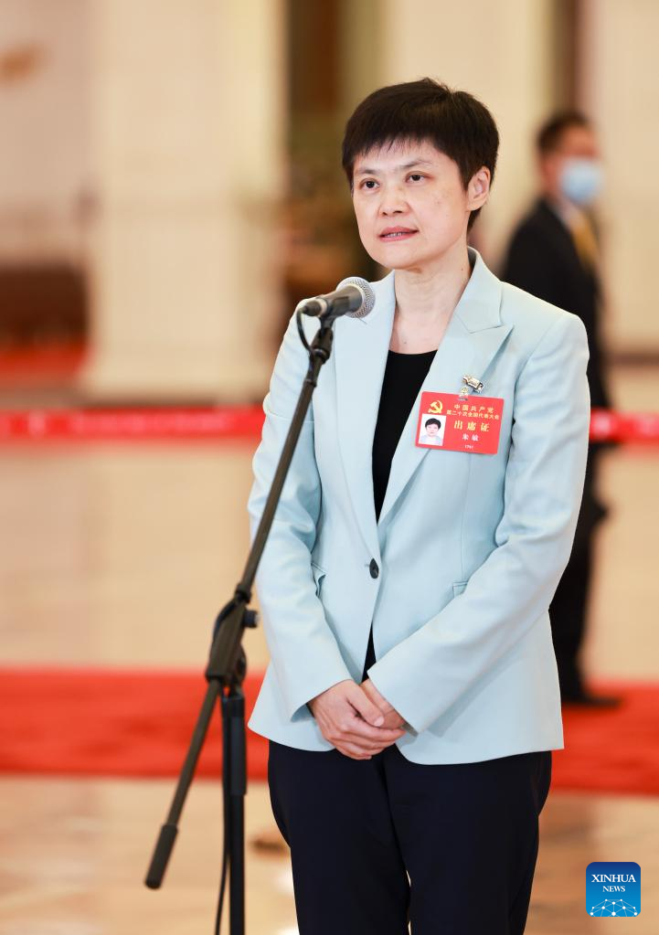 Zhu Min, a delegate to the 20th National Congress of the Communist Party of China (CPC), speaks during an interview at the Great Hall of the People in Beijing, capital of China, Oct. 22, 2022. The 20th CPC National Congress concluded on Saturday. (Xinhua/Xing Guangli)