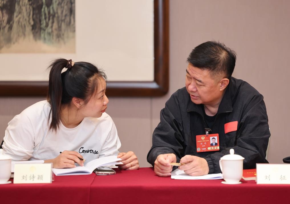 National political advisors Liu Shiying (L) and Liu Zheng communicate at a meeting of national political advisors from sports sector at the third session of the 14th National Committee of the Chinese People's Political Consultative Conference (CPPCC) in Beijing, capital of China, March 5, 2025. (Xinhua/Yin Gang)